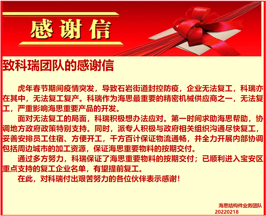 2月18日,公司技術(shù)精密加工事業(yè)部收到客戶熱情洋溢的感謝信,點名感謝團隊5名成員。